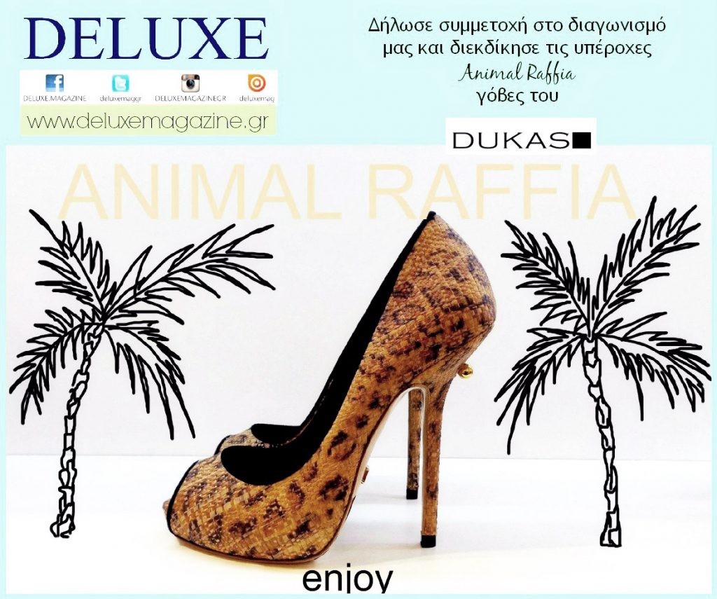 Διεκδίκησε και εσύ με τη συμμετοχή σου στο διαγωνισμό μας, τις υπέροχες ψηλοτάκουνες γόβες Animal Raffia από τη νέα καλοκαιρινή συλλογή του Dukas, για βήματα πολυτέλειας γεμάτα αυτοπεποίθηση και στυλ.