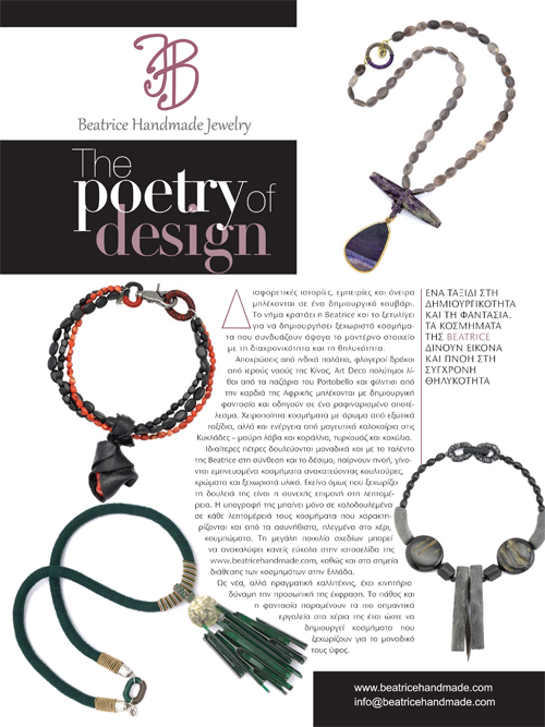 Ιδιαίτερες πέτρες δουλεύονται μοναδικά και με το ταλέντο της Beatrice στη σύνθεση και το δέσιμο, παίρνουν πνοή, γίνονται εμπνευσμένα κοσμήματα ανακατεύοντας κουλτούρες, χρώματα και ξεχωριστά υλικά. Εκείνο όμως που ξεχωρίζει τη δουλειά της είναι η συνεχής επιμονή στη λεπτομέρεια. Η υπογραφή της μπαίνει μόνο σε καλοδουλεμένα σε κάθε λεπτομέρειά τους κοσμήματα που χαρακτηρίζονται και από τα ασυνήθιστα, πλεγμένα στο χέρι, κουμπώματα. Τη μεγάλη ποικιλία σχεδίων μπορεί να ανακαλύψει κανείς εύκολα στην ιστοσελίδα της www.beatricehandmade.com, καθώς και στα σημεία διάθεσης των κοσμημάτων στην Ελλάδα.