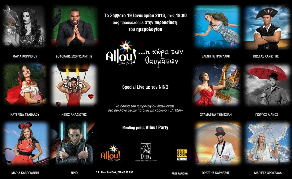 Το Allou! Fun Park, το μεγαλύτερο πάρκο ψυχαγωγίας της χώρας, γιορτάζοντας τα 10 χρόνια λειτουργίας του έρχεται ξανά κοντά στα παιδιά με ανάγκη μέσα από το «μαγικό» ημερολόγιο «Allou! Fun Park, η χώρα των θαυμάτων», έσοδα του οποίου διατίθενται στο σύλλογο φίλων παιδιών με καρκίνο «ΕΛΠΙΔΑ».